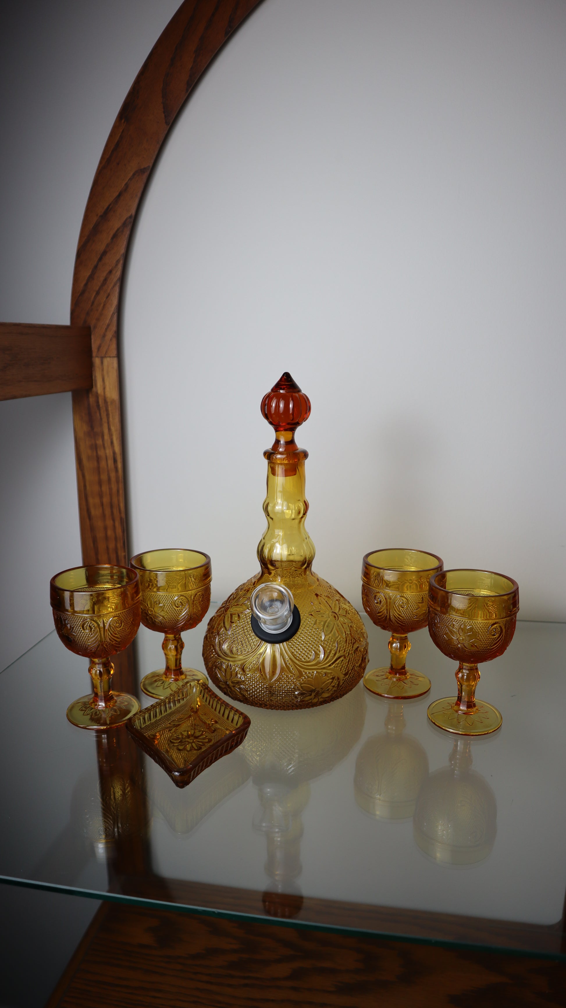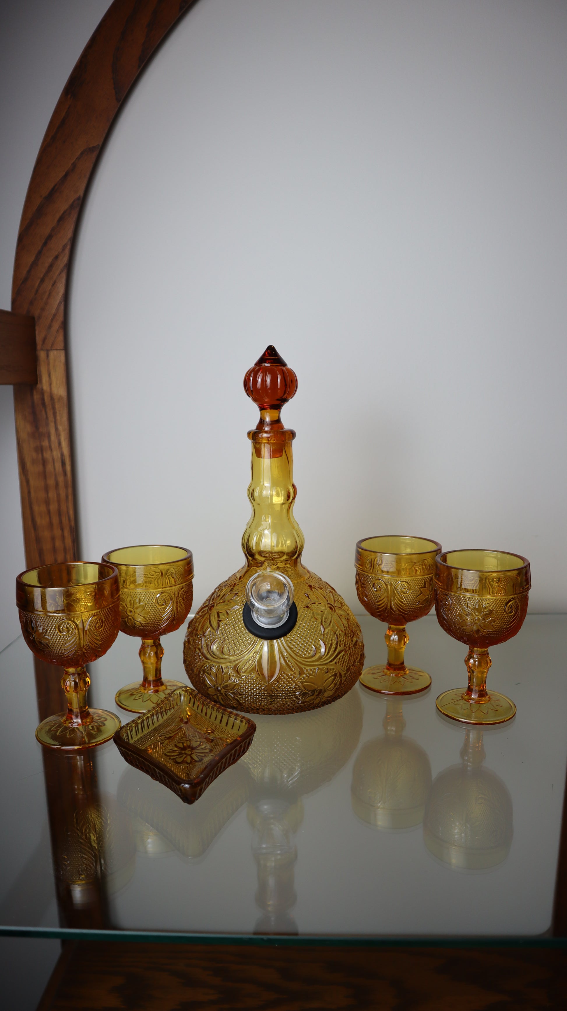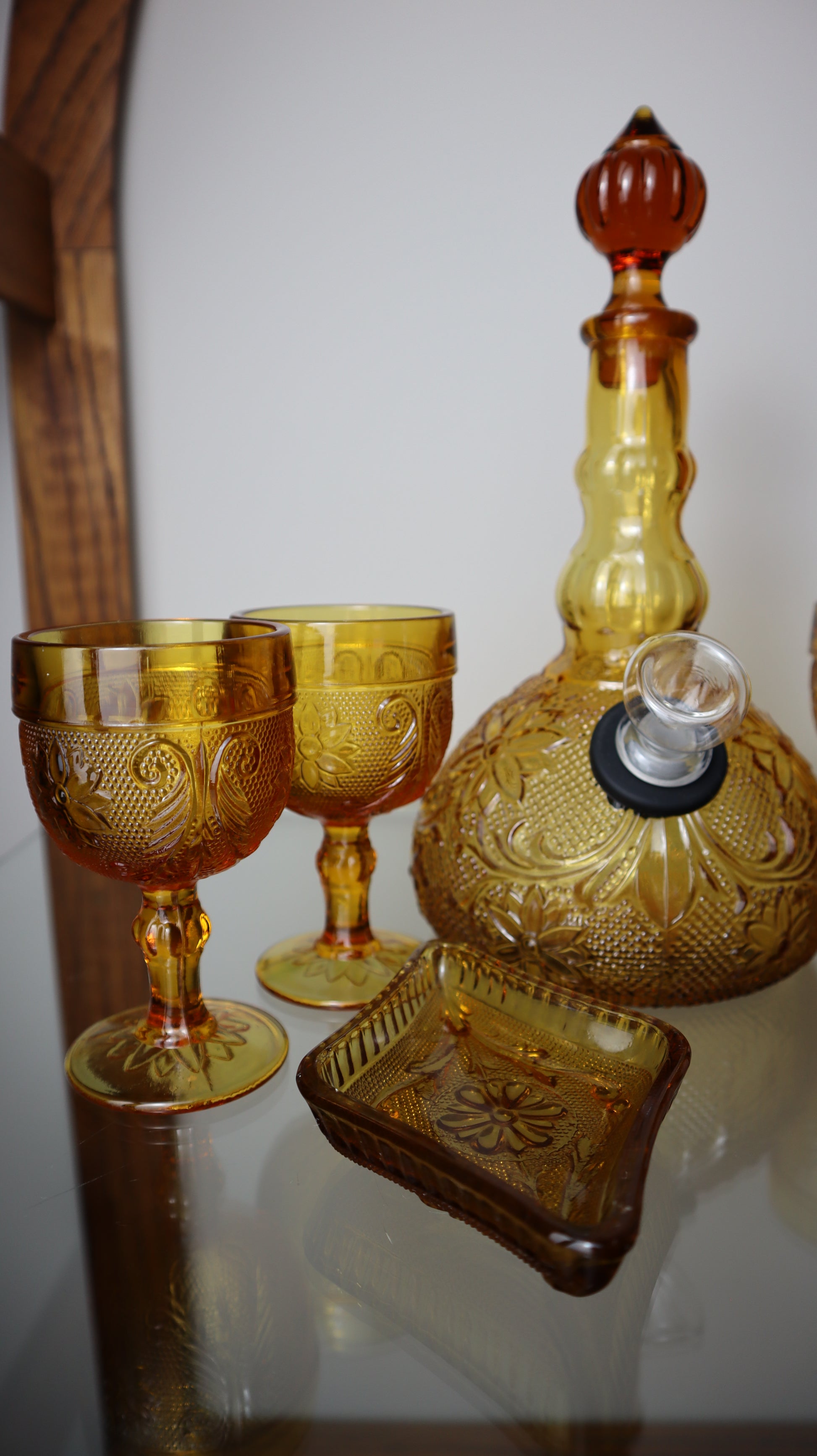 This beautiful Tiara decanter has been transformed into a stunning water pipe with perfect functionality! Comes with four matching amber cups from the original set!