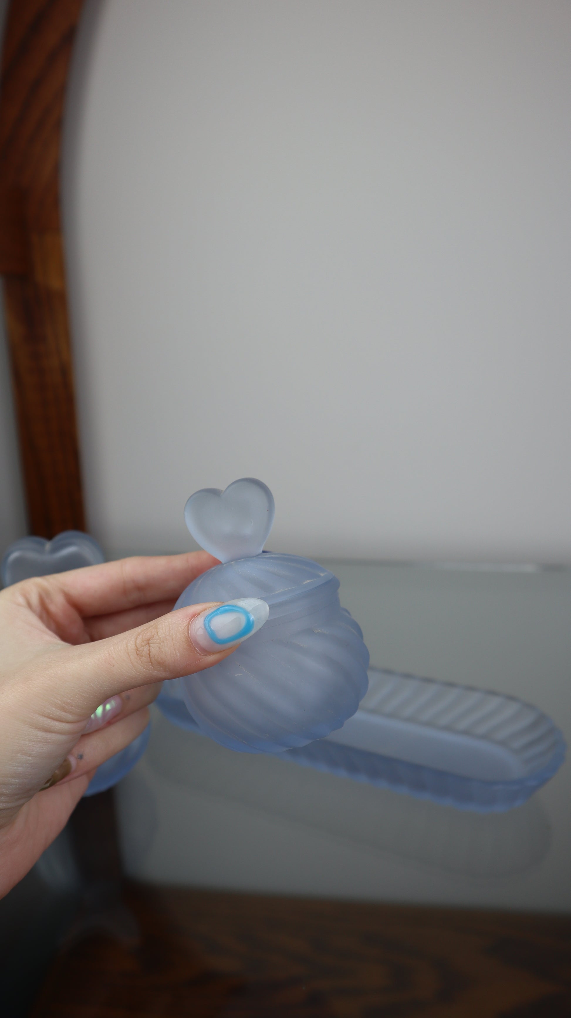 This vintage blue frosted glass set would be a cute addition to your glass collection.
